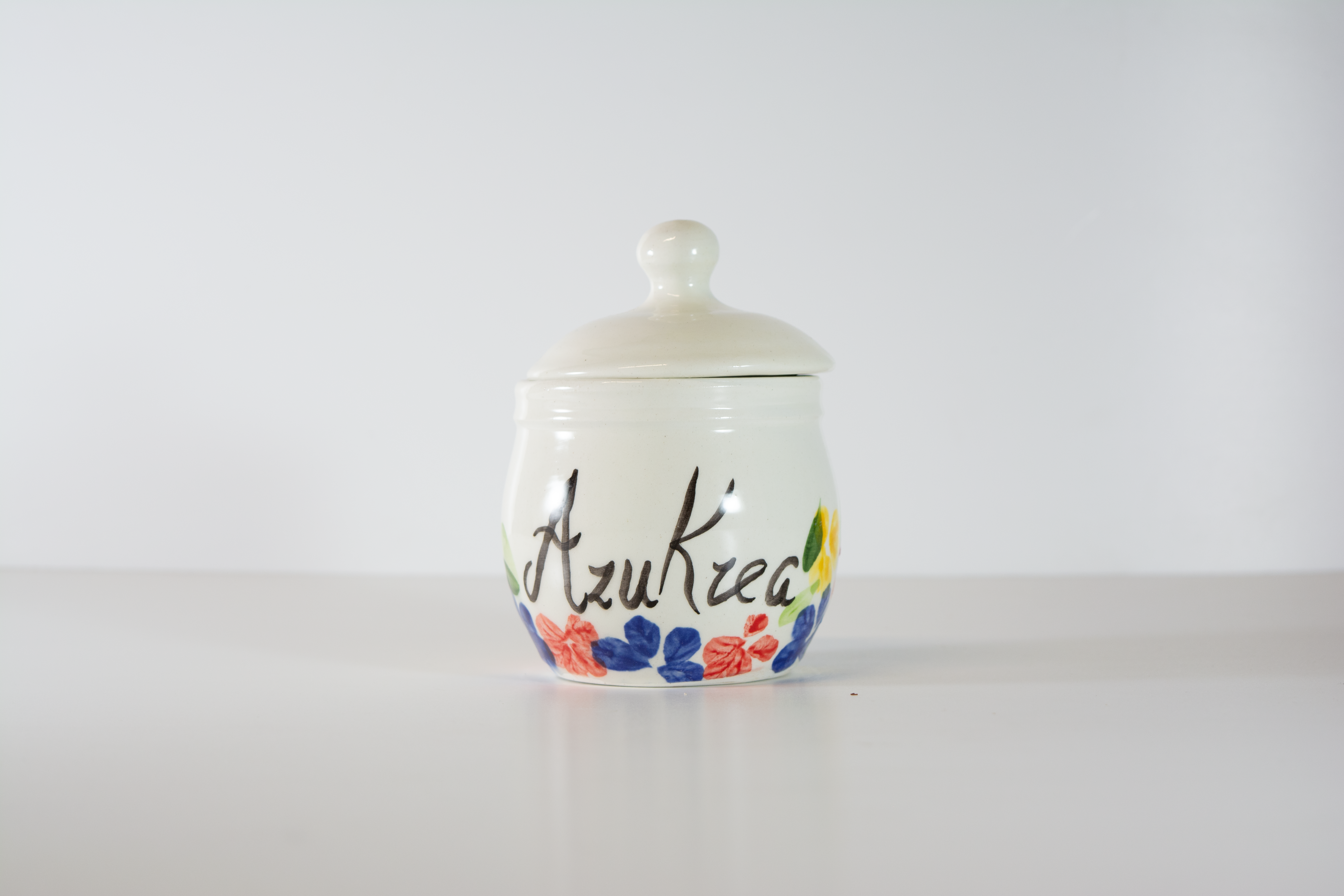 Azucarero con tapa, elaborado de cerámica, pintado a mano.