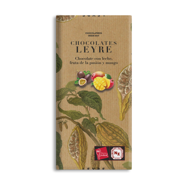 Ingredientes: Azúcar, manteca de cacao, leche entera en polvo, pasta de cacao, suero de leche, pasta de fruta de la pasión 6%, pasta de mango 6%, emulgente (lecitina de soja), aromas (vainillina). Puede contener trazas de frutos secos.