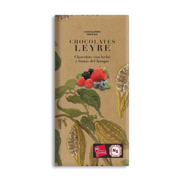 Ingredientes: Azúcar, manteca de cacao, leche entera en polvo, pasta de cacao, suero de leche, pasta de frutas del bosque 10%, emulgente (lecitina de soja), aromas (vainillina). Puede contener trazas de frutos secos.