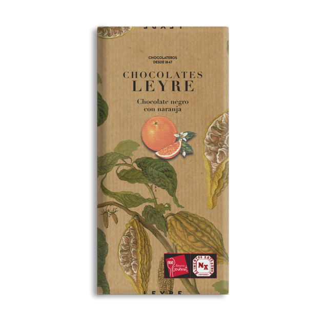 Ingredientes: Azúcar, pasta de cacao, manteca de cacao, naranja 15%, emulgente (lecitina de soja), aromas (naranja y vainillina). Puede contener trazas de leche y frutos secos.