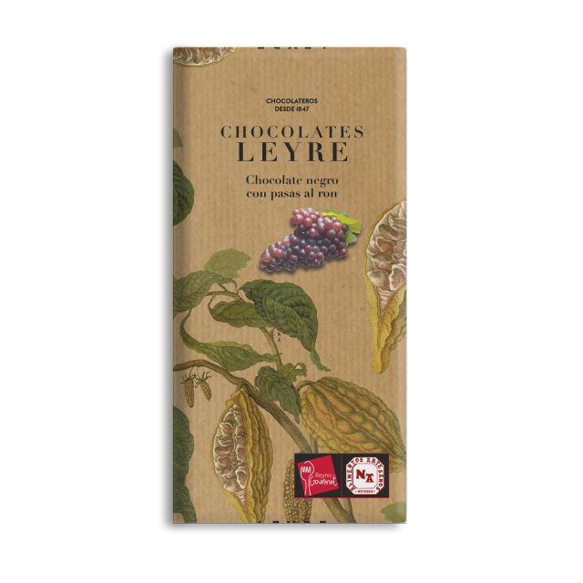 Ingredientes: Azúcar, pasta de cacao, nueces 9%, pasas 9%, manteca de cacao, emulgente (lecitina de soja E-322), aroma (vainillina). Puede contener trazas de leche y frutos secos.