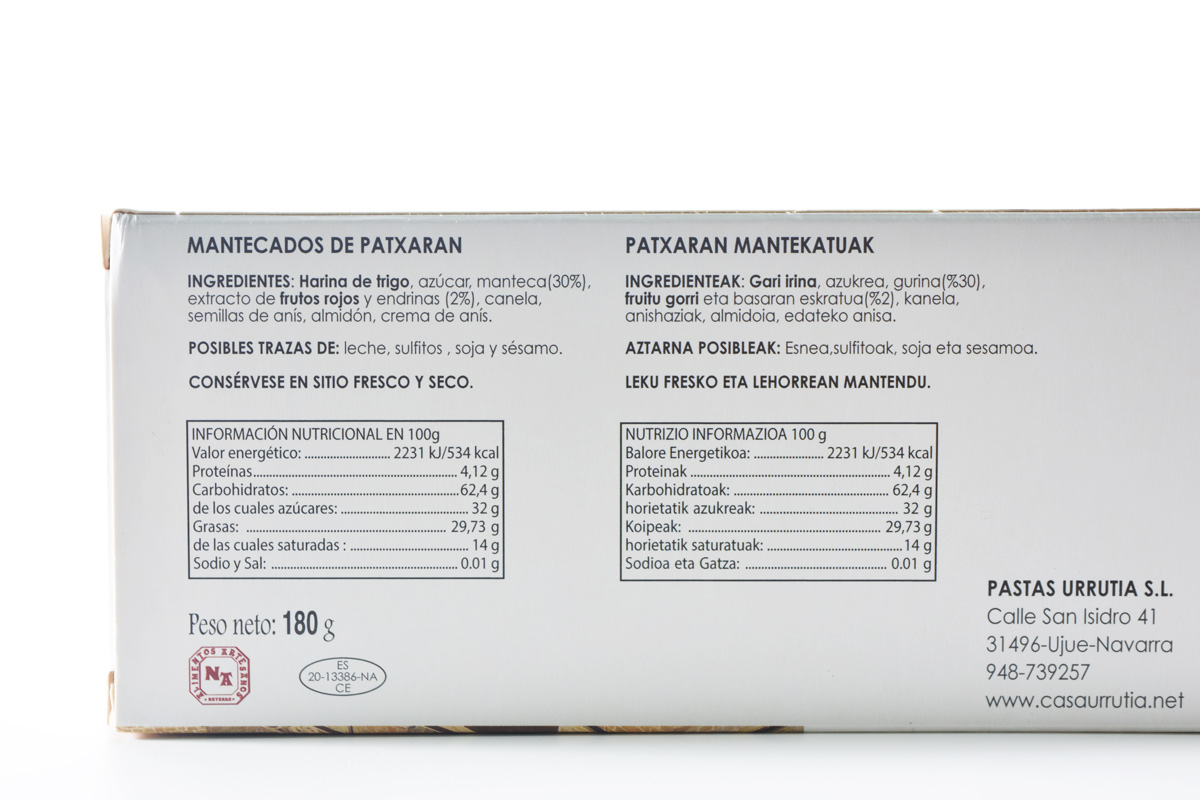 Ingredientes: Harina de trigo, azúcar, manteca de cerdo (30%), extracto de frutos rojos y endrinas (2%), canela, semillas de anís y aroma de patxaran.