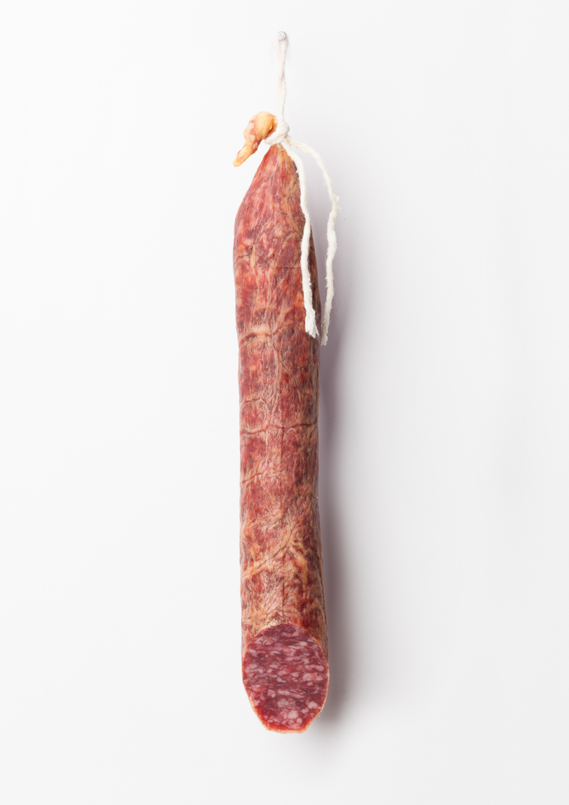 Paleta y panceta de cerda, sal, azúcares, especias naturales, fermentos lácticos y colorante natural.