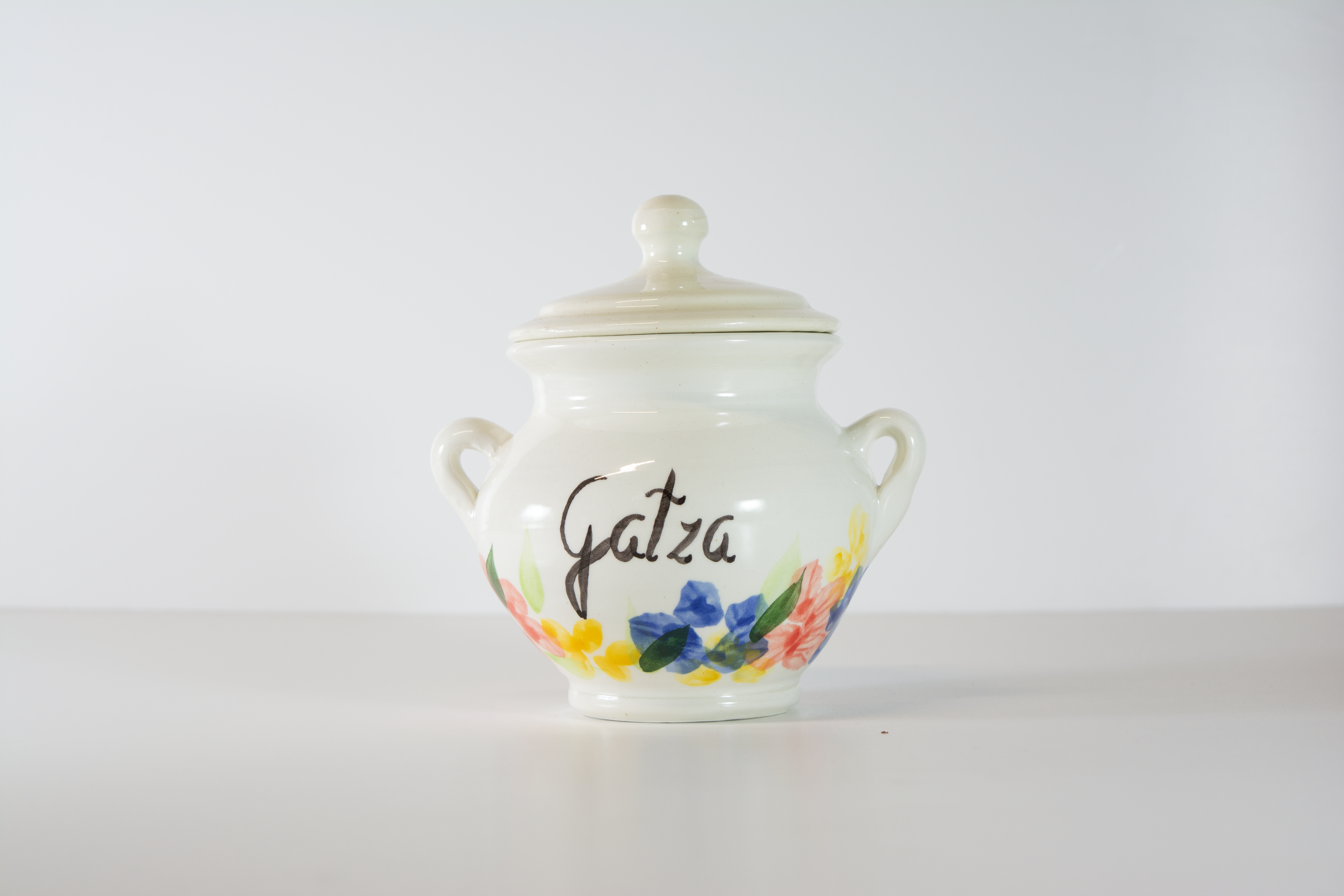 Recipiente de cerámica con tapa y dos asas que se utiliza para colocar la sal. El producto está pintado a mano de color blanco, diseño de flores de colores y el nombre de lo que contiene.