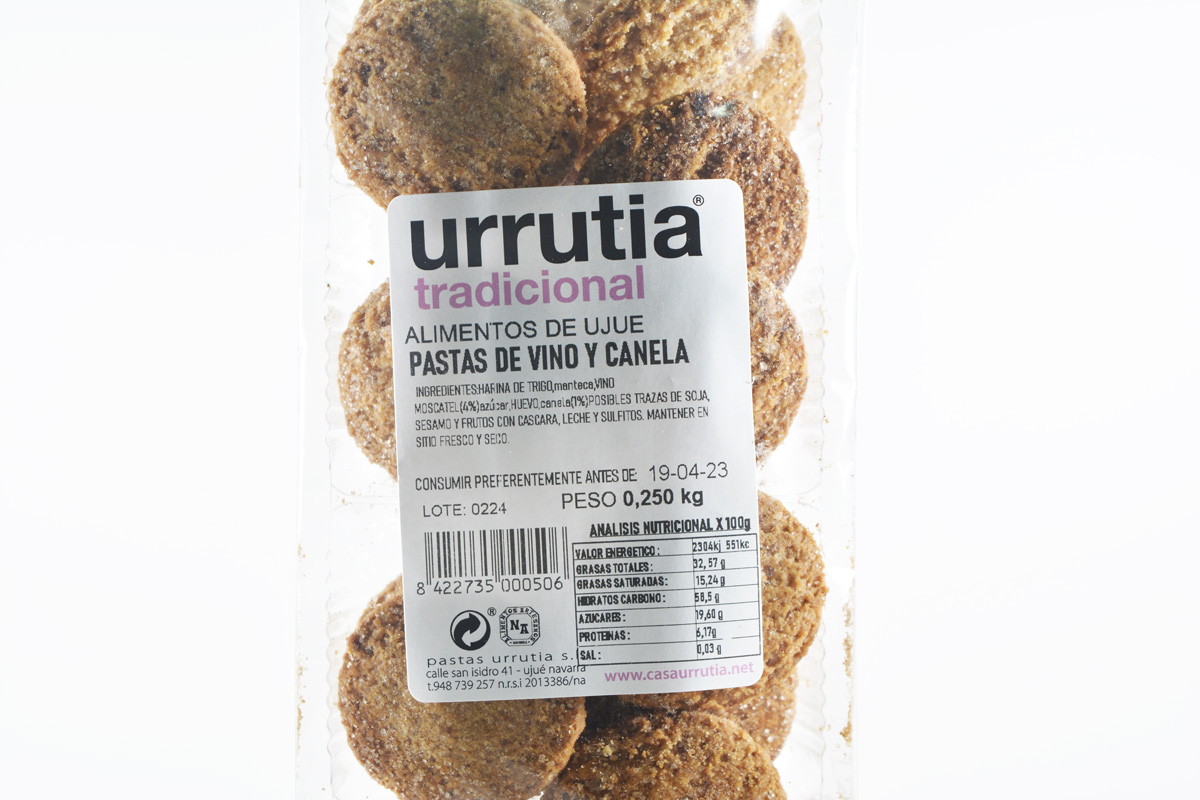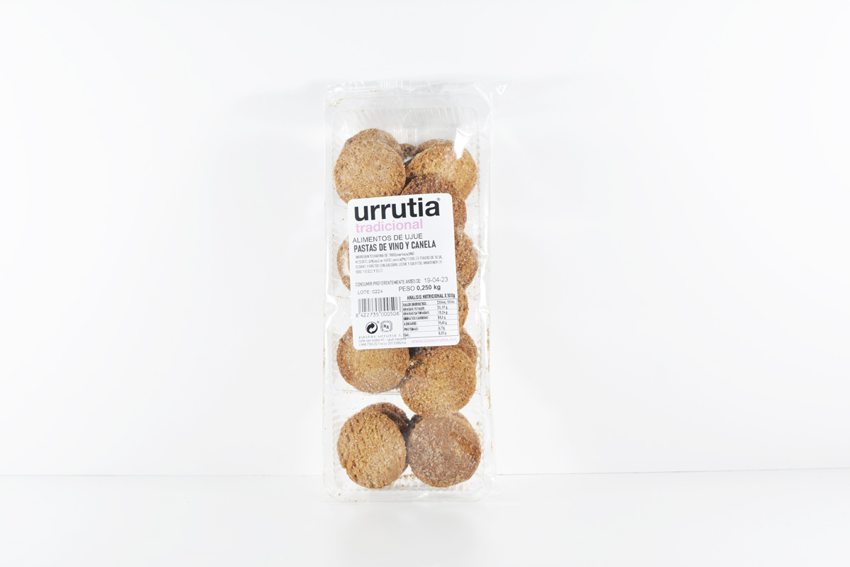Ingredientes: Harina de trigo, azúcar, manteca de cerdo (30%), estracto de frutos rojos y endrinas (2%), canela, semillas de anis y aroma de patxaran.