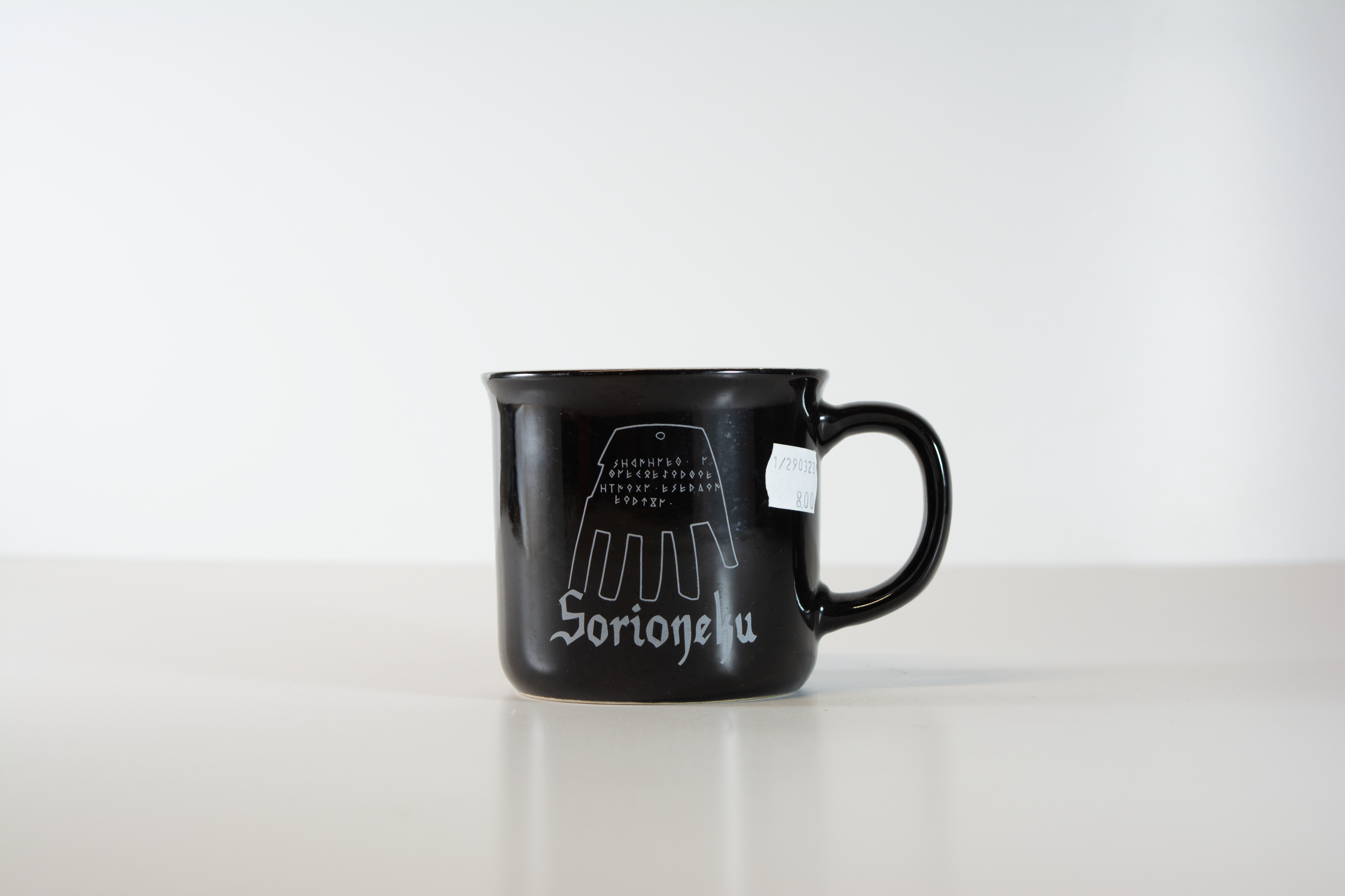 Taza de cerámica negra con impresión de la mano con el texto vasco más antiguo del mundo "sorioneku" que traducido significa "de buena fortuna".