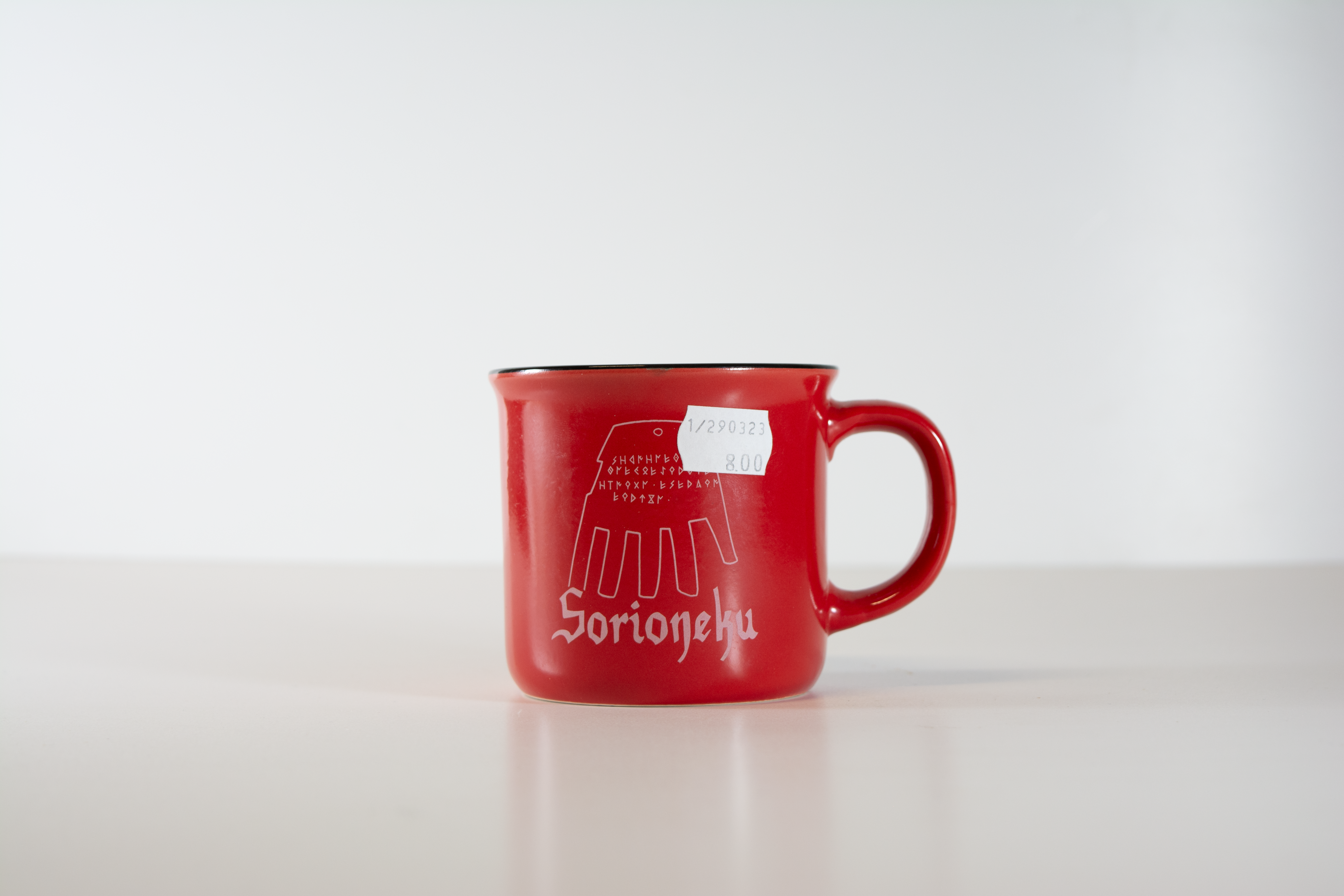 Taza de cerámica roja con impresión de la mano con el texto vasco más antiguo del mundo "sorioneku" que traducido significa "de buena fortuna".